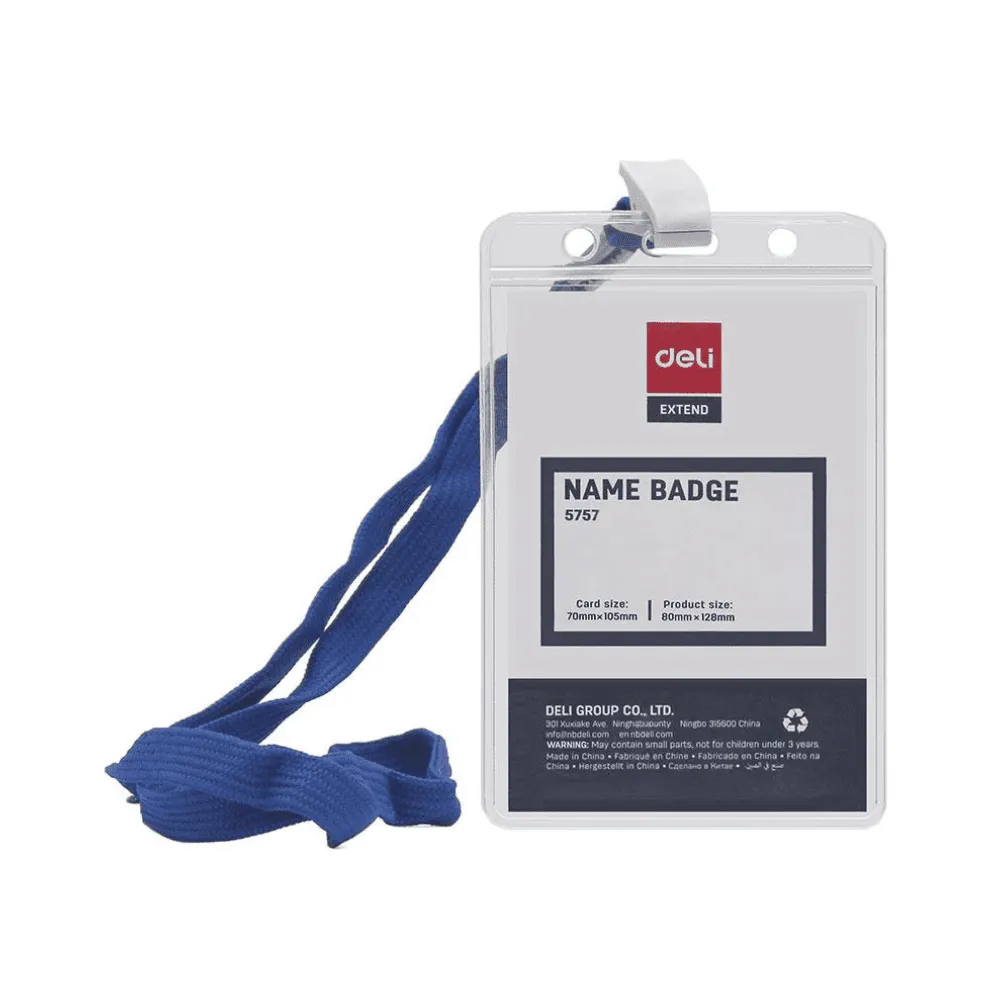 <p>Бейдж вертикальный DELI размером 80 × 128 мм (открытое поле 70 × 105 мм) на шнурке, синий — это практичное решение для идентификации сотрудников, участников мероприятий или гостей. Прозрачная поверхность обеспечивает четкое отображение информации, а вертикальная ориентация позволяет удобно разместить текст или фотографию. Прочный материал защищает документ от повреждений, а комплектный шнурок обеспечивает удобное ношение бейджа на шее, гарантируя комфорт при длительном использовании. Яркий синий цвет делает бейдж заметным и эстетичным. DELI 80 × 128 мм — это сочетание надежности, удобства и аккуратного дизайна, которое обеспечивает профессиональное и комфортное представление информации.</p>