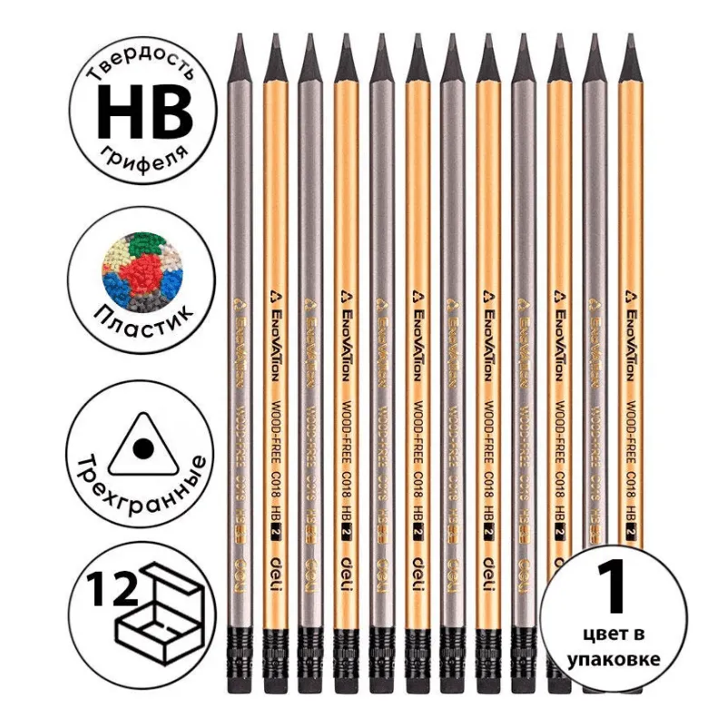 <p>Качественный графитовый карандаш DELI "EnoVation" с твёрдостью грифеля HB — универсальный выбор для письма, рисования и черновых набросков. Трёхгранный эргономичный корпус из прочного пластика удобно лежит в руке и предотвращает скольжение. Оснащён встроенным ластиком для быстрой коррекции записей.</p><p>Ассорти цветов делает его привлекательным для школьников и студентов, а прочный корпус обеспечивает долговечность даже при активном использовании.</p>