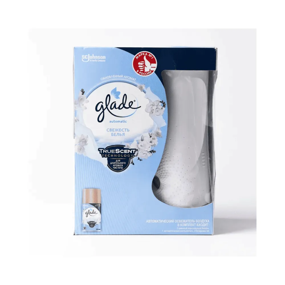 <p>Комплект освежителя воздуха Glade Automatic «Свежесть белья» с баллоном 269 мл наполняет помещение лёгким ароматом свежевыстиранного белья, создавая атмосферу чистоты, свежести и уюта. Средство автоматически поддерживает комфортный аромат, нейтрализует неприятные запахи и делает пространство приятным в любое время. Комплект включает автоматический освежитель и сменный баллон объёмом 269 мл, что обеспечивает простоту использования и долгую работу. Glade Automatic «Свежесть белья» превращает каждый день в свежий и уютный уголок, создавая комфорт и приятную атмосферу дома или в офисе.</p>