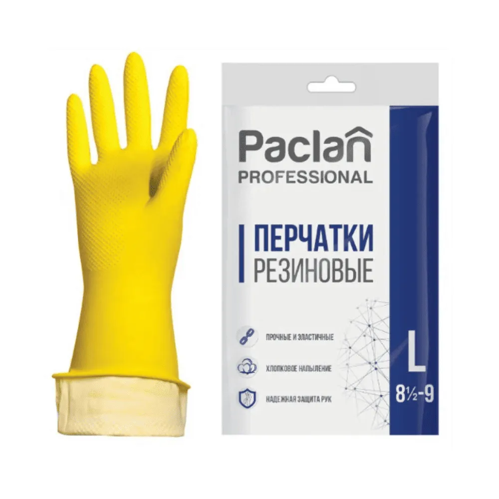 <p>Латексные перчатки PACLAN Professional с хлопковым напылением, плотные, жёлтого цвета, размер L, обеспечивают надёжную защиту рук при работе с водой, бытовой химией и загрязнёнными поверхностями. Хлопковое напыление внутри повышает комфорт, предотвращает потение и делает использование перчаток удобным даже при длительной работе. Прочная латексная структура гарантирует устойчивость к разрывам, хорошее сцепление с поверхностями и позволяет аккуратно выполнять задачи, требующие точности. Размер L обеспечивает удобную посадку на руке, сохраняя свободу движений и комфорт при любых действиях. PACLAN Professional сочетает практичность, защиту и долговечность, делая домашние и профессиональные работы безопасными, удобными и эффективными.</p>