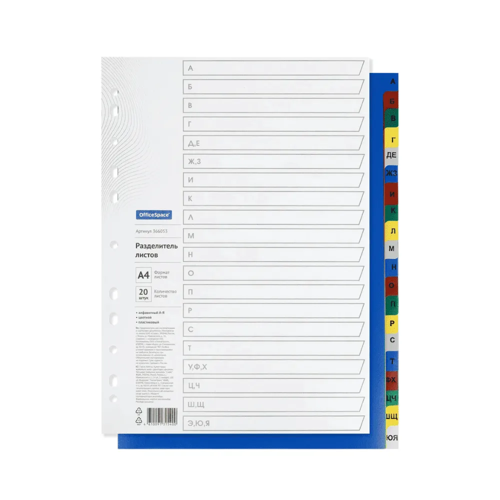 Разделитель листов OfficeSpace А4, 20 листов, алфавитный А-Я, цветной, пластиковый