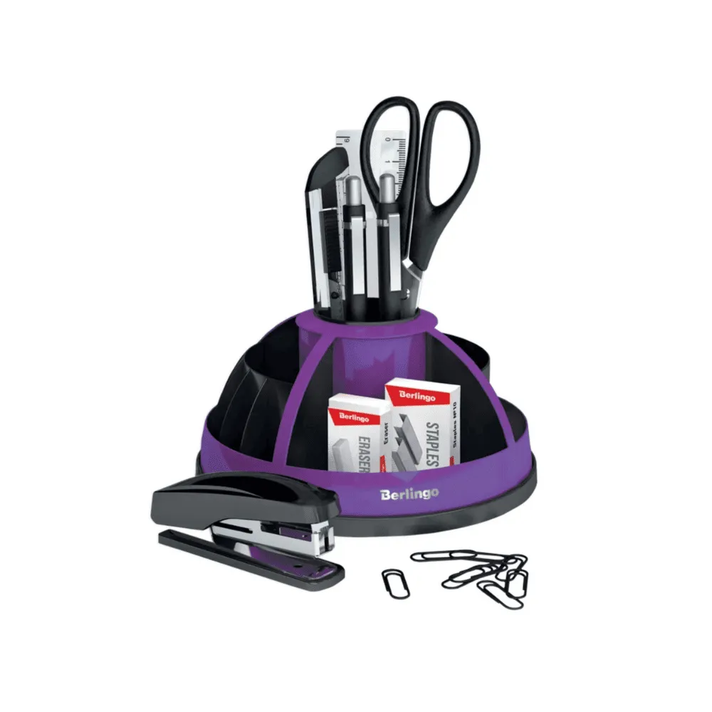 <p>Настольный набор Berlingo "BR" на 9 предметов сочетает функциональность и яркий дизайн. Вращающаяся конструкция обеспечивает лёгкий доступ к канцелярским принадлежностям, позволяя быстро находить нужные предметы и поддерживать порядок на рабочем месте. Оригинальное сочетание чёрного и фиолетового цветов делает набор не только практичным, но и стильным элементом интерьера. Он подойдёт как для офиса, так и для домашнего кабинета, добавляя рабочему пространству удобство и индивидуальность.</p>