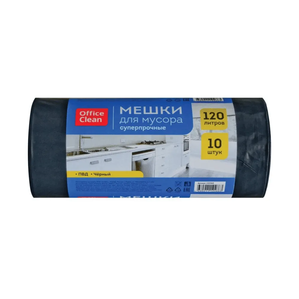 Мешки для мусора 120 литров, OfficeClean ПВД, 68*105см, 55мкм, 10шт., суперпрочные, черные, в рулоне