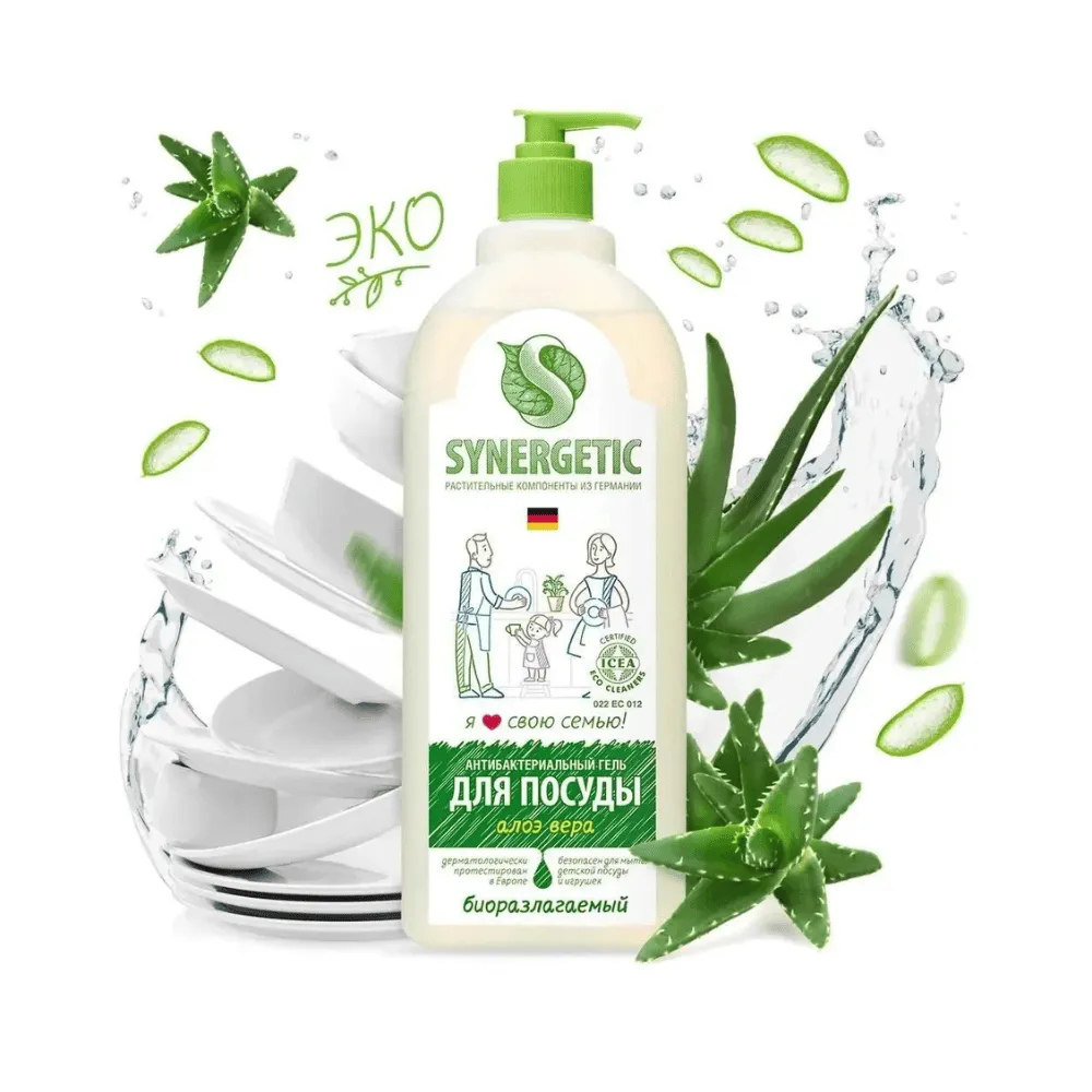 <p>Средство для мытья посуды Synergetic «Алоэ Вера», объемом 1000 мл с дозатором, эффективно очищает посуду от жира и загрязнений, обеспечивая антибактериальный эффект. Формула с экстрактом алоэ вера бережно ухаживает за руками, предотвращая пересушивание кожи, и придаёт процессу мытья комфорт и лёгкость. Удобная бутылка с дозатором позволяет экономно расходовать средство и точно дозировать его при каждом использовании. Большой объем 1000 мл делает продукт практичным для семейного или регулярного применения. Synergetic «Алоэ Вера» сочетает эффективность, заботу о коже и антибактериальную защиту, превращая ежедневное мытьё посуды в безопасную, комфортную и приятную процедуру.</p>