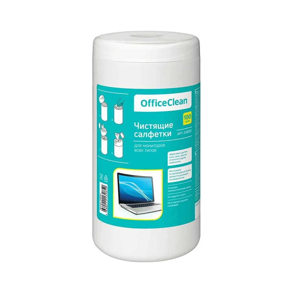 Салфетки чистящие влажные OfficeClean, для экрнов/мониторов, 100 шт в тубе